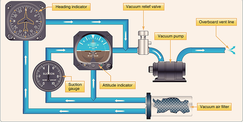 A typical vacuum system consists of an engine-driven vacuum pump, relief valve, air filter, gauge, and tubing necessary to complete the connections. The gauge is mounted in the aircraft’s instrument panel and indicates the amount of pressure in the system (vacuum is measured in inches of mercury less than ambient pressure).