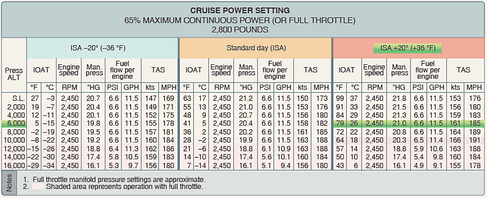 Refer to Figure 11-28 for this sample problem. First, locate the pressure altitude of 6,000 feet on the far left side of the table. Follow that line across to the far right side of the table under the 20 °C (or 36 °F) column. At 6,000 feet, the rpm setting of 2,450 will maintain 65 percent continuous power at 21.0 "Hg with a fuel flow rate of 11.5 gallons per hour and airspeed of 161 knots.