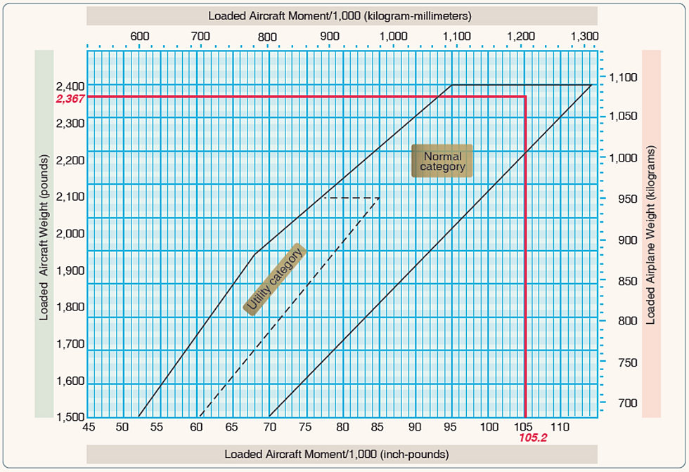 The same steps should be followed in the graph method as were used in the computational method except the graphs provided will calculate the moments and allow the pilot to determine if the aircraft is loaded within limits. To determine the moment using the loading graph, find the weight and draw a line straight across until it intercepts the item for which the moment is to be calculated. Then draw a line straight down to determine the moment. (The red line on the loading graph in Figure 10-7 represents the moment for the pilot and front passenger. All other moments were determined the same way.) Once this has been done for each item, total the weight and moments and draw a line for both weight and moment on the CG envelope graph. If the lines intersect within the envelope, the aircraft is loaded within limits. In this sample loading problem, the aircraft is loaded within limits.